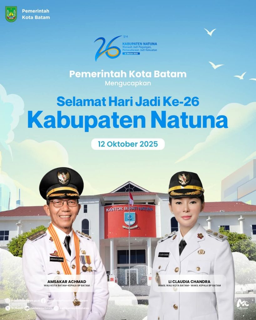NATUNA Selamat Hari Jadi ke-26 Kabupaten Natuna! October 12, 2025 Abas Saputra Semoga Natuna terus maju, sejahtera, dan menjadi kebanggaan di perbatasan utara Indonesia. Dengan semangat persatuan dan kerja nyata, mari kita wujudkan “Natuna Maju untuk Indonesia Hebat!” Pengunjung : 42 Spread the love