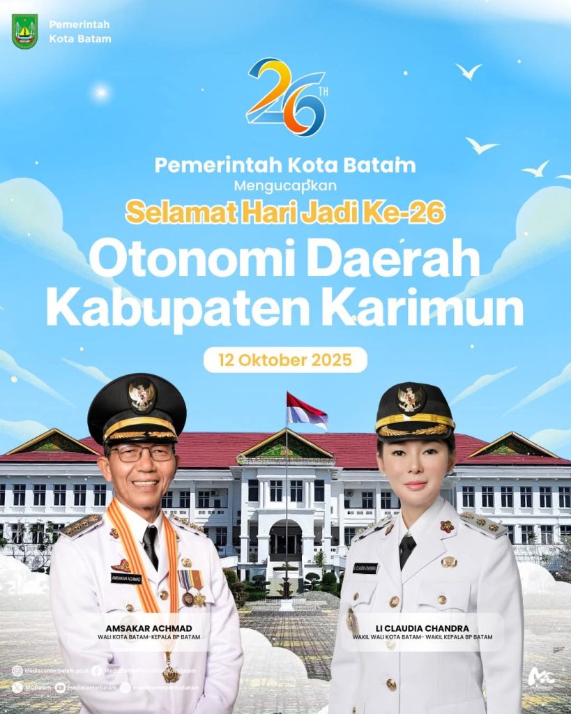KARIMUN Selamat Hari Jadi ke-26 Otonomi Daerah Kabupaten Karimun! October 12, 2025 Abas Saputra Semoga semangat otonomi terus menjadi kekuatan dalam membangun Karimun yang maju, mandiri, dan sejahtera.Dengan sinergi pemerintah dan masyarakat, mari wujudkan “Karimun Maju, Indonesia Hebat!” Pengunjung : 45 Spread the love