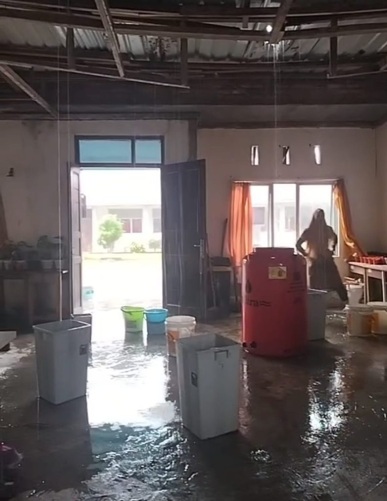Setiap kali langit mengguyur, guru dan murid di sekolah ini punya ritual tak tertulis: memindahkan buku, menyingkirkan meja, dan menampung air yang menetes dari langit-langit. Di ruang guru, genangan air menjadi pemandangan biasa.