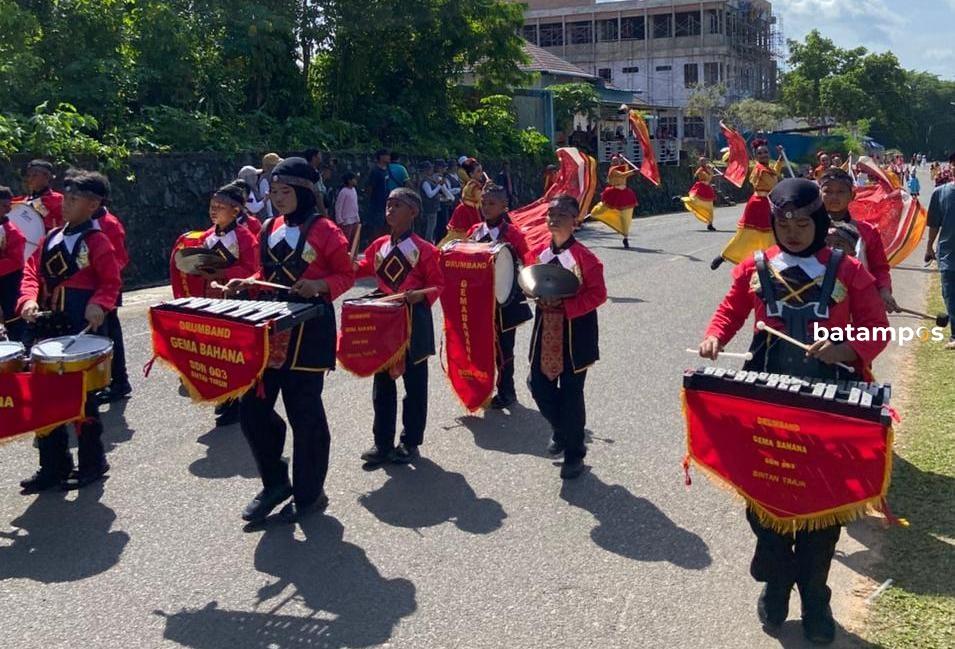 BINTAN — Minggu pagi di Lapangan Antam Kijang, Kecamatan Bintan Timur, terasa berbeda. Dentuman bass drum berpadu dengan derap langkah para pemain drumband memecah udara. Di tengah sorotan mata penonton, barisan seragam biru muda dari Gema Bahana Sdanta SDN 003 Bintan Timur tampil penuh percaya diri.