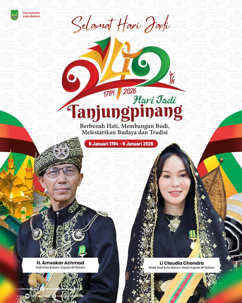 Atas nama Pemerintah Kota Batam, Wali Kota Batam Amsakar Achmad dan Wakil Wali Kota Batam Li Claudia Chandra, mengucapkan, Selamat Hari Jadi ke-242 Tanjungpinang.