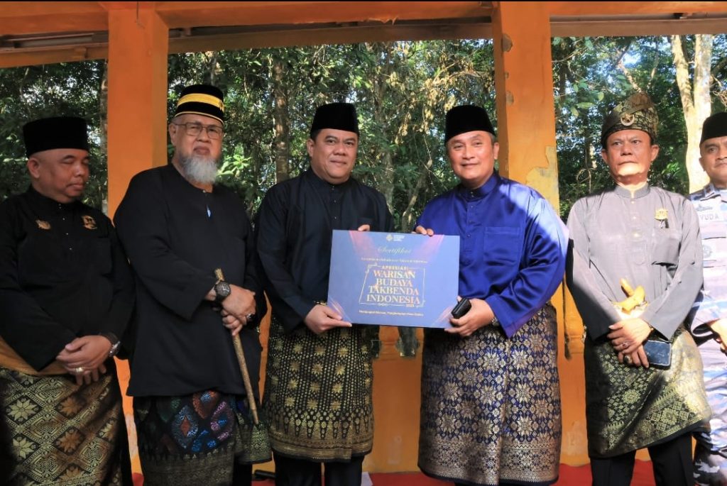 Sekretaris Daerah Kabupaten Bintan, Ronny Kartika menerima piagam Warisan Budaya Tak Benda Indonesia (WBTB Indonesia) saat menghadiri Kenduri Merohom Bukit Batu, Jumat (16/01/2026) di Kompleks Makam Marhum Bukit Batu, Desa Bintan Buyu, Kecamatan Teluk Bintan. f-humas