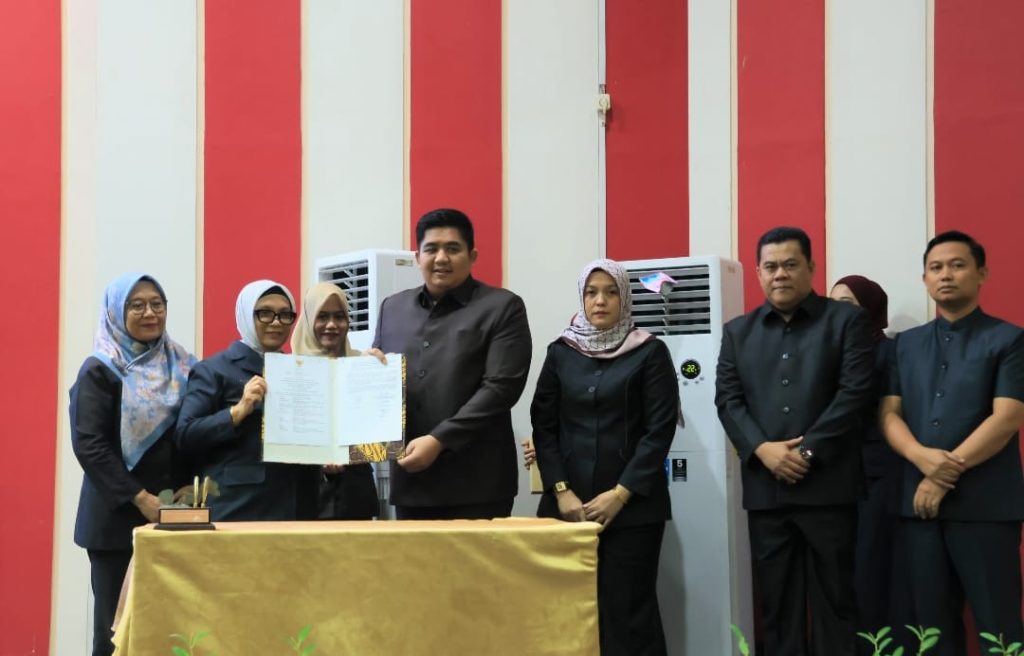 Bupati Bintan Roby Kurniawan didampingi Wakil Bupati Deby usai meneken Ranperda saat Rapat Paripurna Pengesahan Rancangan Peraturan Daerah (Ranperda) tentang Perusahaan Perseroan Daerah Bintan Karya Bahari, Selasa (20/1/2026), bertempat di Ruang Sidang Paripurna DPRD Bintan. f-humas
