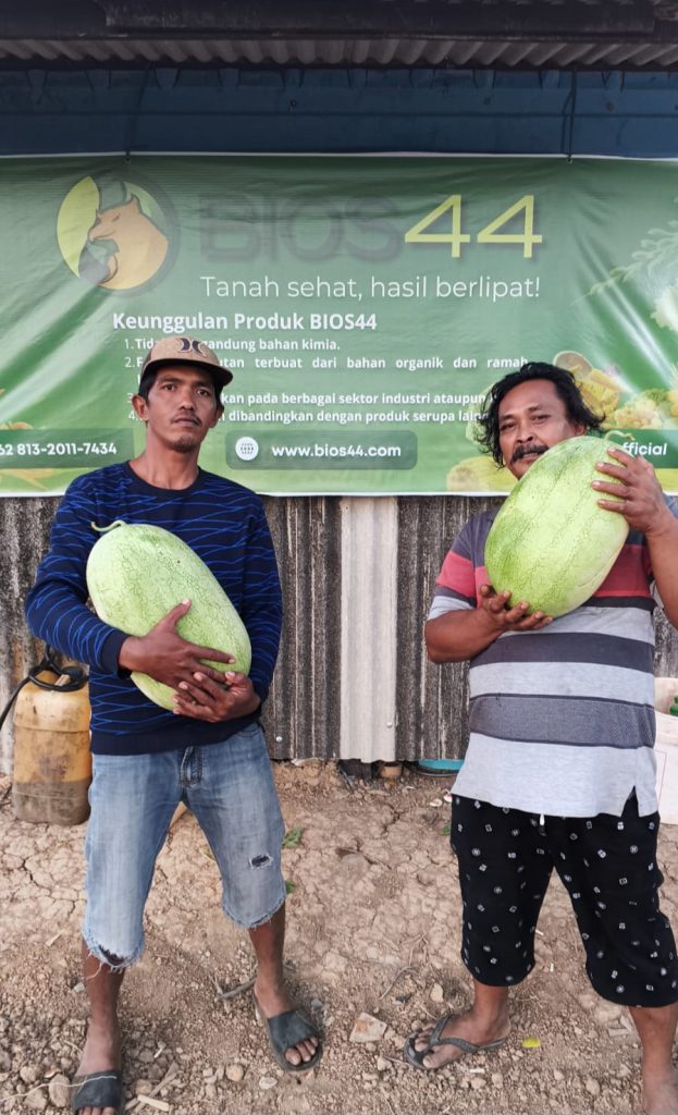 “Alhamdulillah, sejak pakai BIOS 44, tanaman semangka kami tumbuh subur dan buahnya lebih besar serta berat. Panennya meningkat dan kualitasnya juga lebih bagus,” ujar Agus.