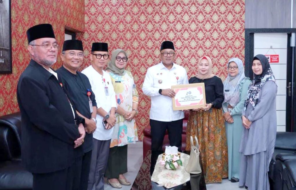Penyerahan hasil penggalangan dana bantuan korban bencana alama Sumatera dari Ketua Kwarcab Gerakan Pramuka Kota Tanjungpinang, Kak Yuniarni Pustoko Weni ke Wali Kota Tanjungpinang, H.Lis Darmansyah saat audiensi di Ruang Kantor Wali Kota, Senin (2/3/2026). f-humas