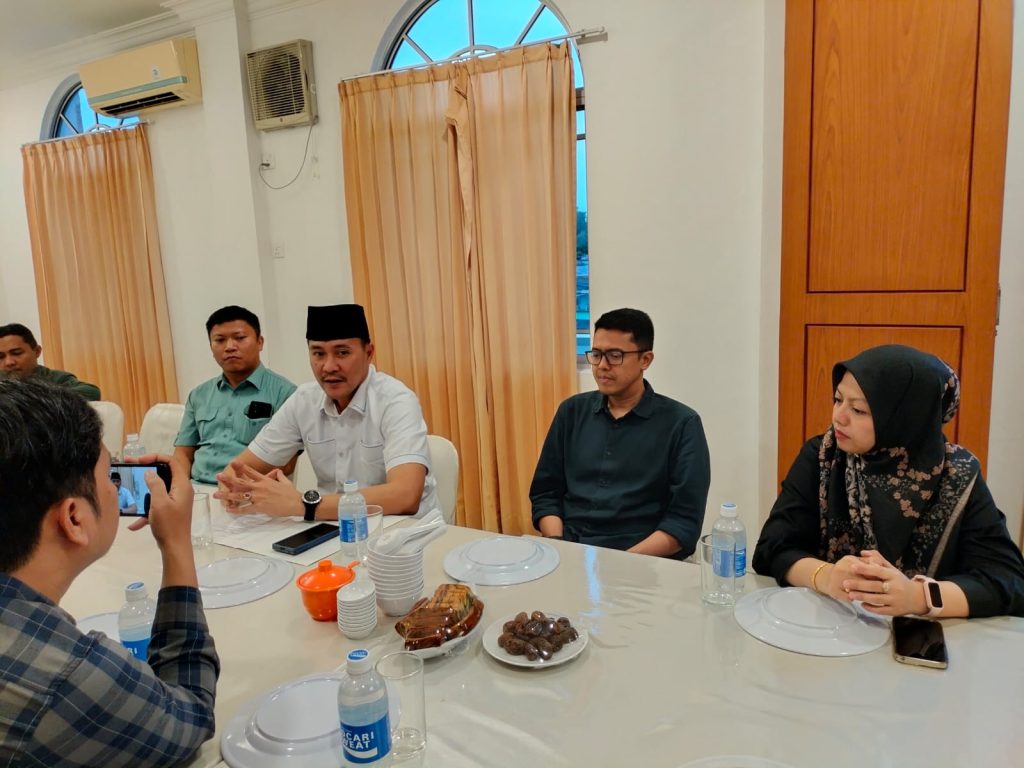 Kepala Kantor BPJS Ketenagakerjaan Tanjungpinang, Iwan Kurniawan (mengenakan peci) saat menyampaikan keterangan kepada wartawan di Restoran Sei Enam Teluk Keriting, Rabu (4/3/2026). f-katasiber.