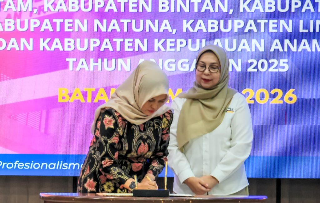 Wakil Bupati Bintan, Deby Maryanti saat menandatangani berita acara penyerahan LKPD Kabupaten Bintan Unaudited Tahun Anggaran 2025 ke Badan Pemeriksa Keuangan (BPK) RI Perwakilan Kepri, Selasa (31/3/2026) di Auditorium BPK RI Perwakilan Kepri, Kota Batam. f-humas